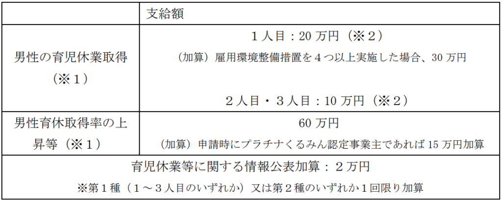 男性労働者が育児休業を取得しやすい雇用環境の整備措置(育児・介護休業法に係るものに限る)を2つ以上(育児・介護休業法第9条の3第4項の規定に基づき出生時育児休業開始予定日を期間を定めた事業主は3つ以上)実施するとともに、代替する労働者の残業抑制のための業務見直しなどが含まれた労働協約等の規定に基づく業務体制整備等を行い、男性労働者について、子の出生後8週間以内に開始する連続5日以上の育児休業を取得させた中小企業事業主に助成金を支給する。