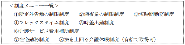 • 介護両立支援制度の打ち「①所定外労働の制限制度」及び「②深夜業の制限制度」については、育児・介護休業法において既にすべての事業主に対して義務付けられているものであるため、両制度を制度メニューから削除する。