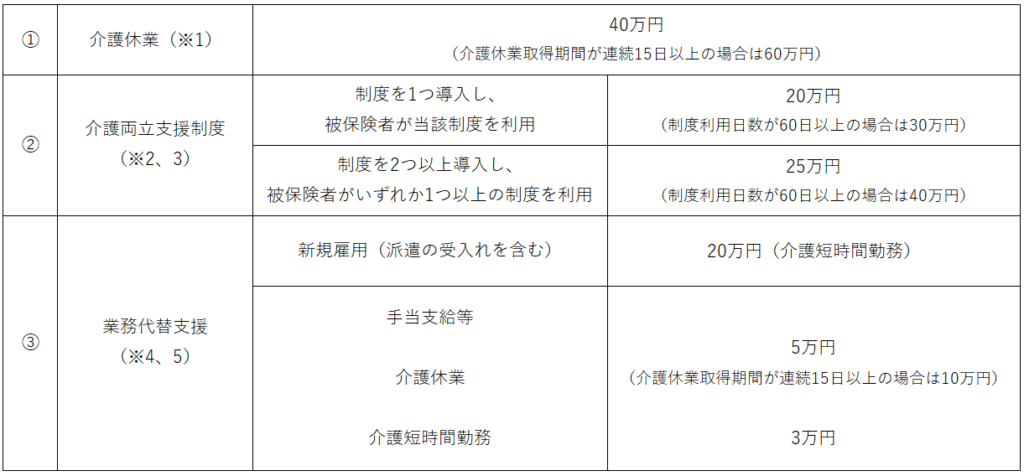 • 介護支援プラン(※)を策定し、同プランに基づき対象被保険者が連続5日以上の介護休業を取得したこと等の要件を満たすこと。