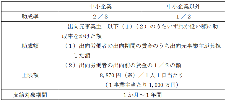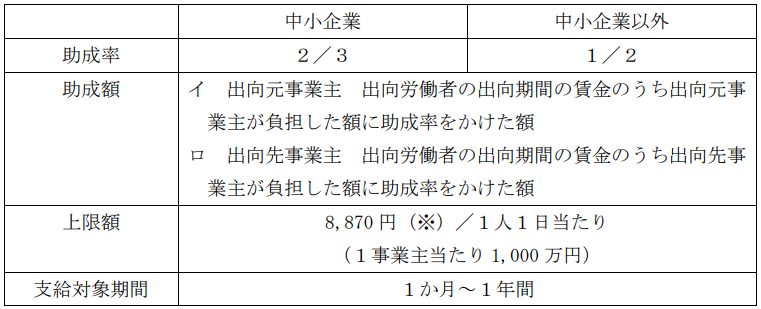 • 出向元事業主及び出向先事業主が同一の出向労働者の出向期間の賃金に関して、出向契約に基づいて負担した額を、下記の通り支給する。