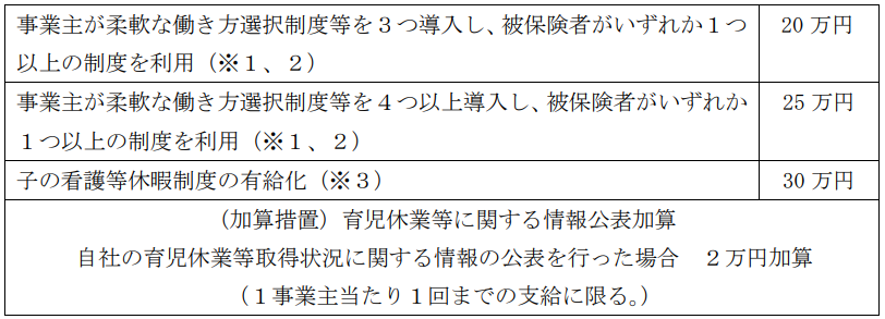 • 障害のある子又は医療的ケア児を養育する対象被保険者について、柔軟な働き方選択制度等又はこの看護等休暇制度(有給)を利用することができる期間を子が18歳になる年度末等迄引き上げた場合、支給額を20万円加算することとする。