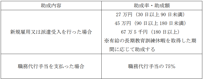 長期教育訓練休暇制度の導入に係る助成について、制度の利用を促進する観点から、中小企業事業主を対象に、長期教育訓練休暇制度の導入や実施、有給の長期教育訓練休暇分の賃金に係る助成に加え、新規雇用又は派遣受入を行った場合や、有給の長期教育休暇取得者に代わって業務を行った職員にチアして職務代行手当を支払った場合には、以下の表の通り上乗せして助成する。