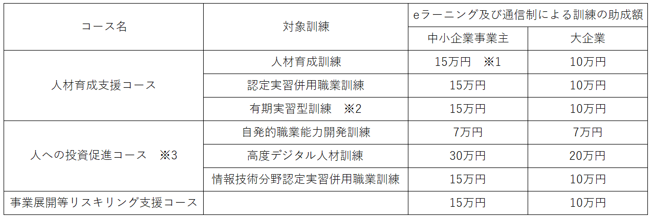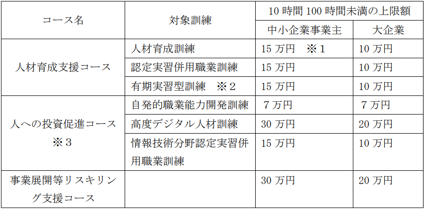 人材育成支援コース、人への投資促進コース及び事業展開等リスキリング支援コースのうち、eラーニング及び通信制による訓練の助成額は、人材開発統括官の定めにより、訓練の実施時間数が10時間以上100時間未満の場合の上限額と同額と定めている。(上限額は下記表の通り)