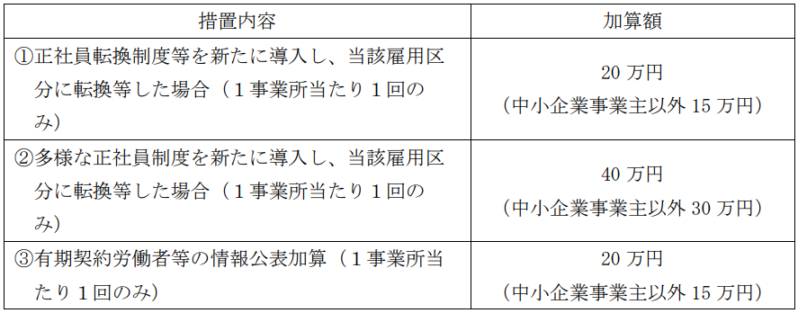 正社員転換制度等の概要、正社員転換等をした有期雇用労働者等の数等の情報公表を行った事業主に対して、1事業所当たり1回に限り20万円(中小企業事業主以外は15万円)を加算して支給する。
