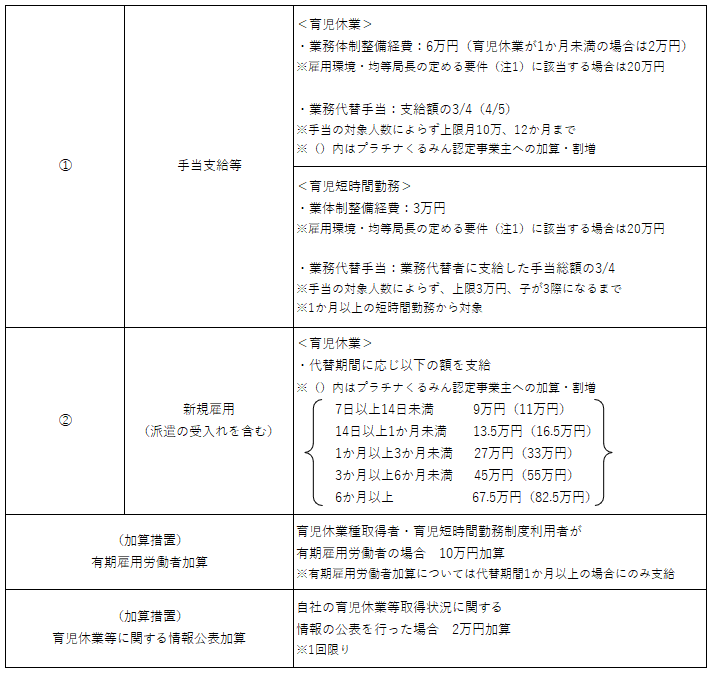 • 「育児休業中の手当支給」及び「育児短時間勤務中野手当支給」の支給対象となる事業主の労働者数要件(常時雇用する労働者の数が300人以下であること)を撤廃する。また、「育児休業中の代替要員の新規雇用(派遣の受入れを含む)」の支給対象となる事業主の労働数要件(中小企業事業主であること)について、要件を緩和し、業種に関わらず常時雇用する労働者が300人以下の事業主であることとする。